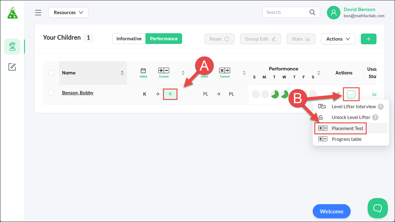 You can see your child's placement test report by clicking on the letter of their newly-assigned level (A) or clicking on the Placement Test for the Learning Mode they are using in the Ellipsis Menu.(B)