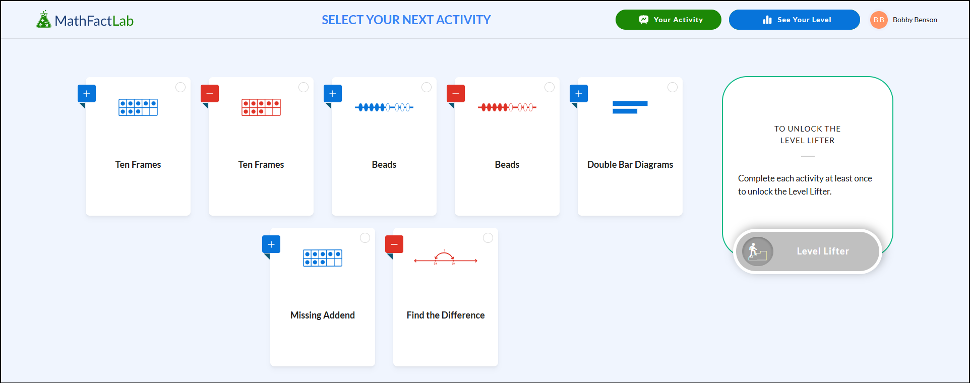 Once your child completes all of the activities (you’ll see green checkmarks on each one), the Level Lifter button will unlock. Your child can then choose to take this assessment. If your child shows a strong understanding of the facts at that level, they will move up to the next level. If they are not quite ready yet, they will return to the same level’s dashboard to get more practice before trying again.