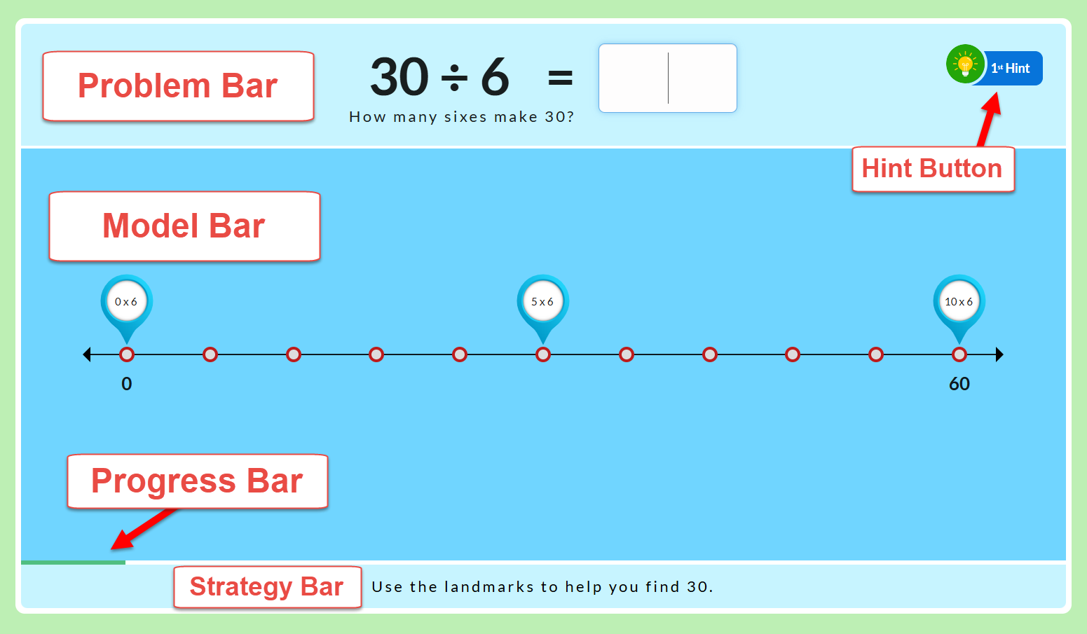 - Hint button - Provides help to guide your child in using the strategy.