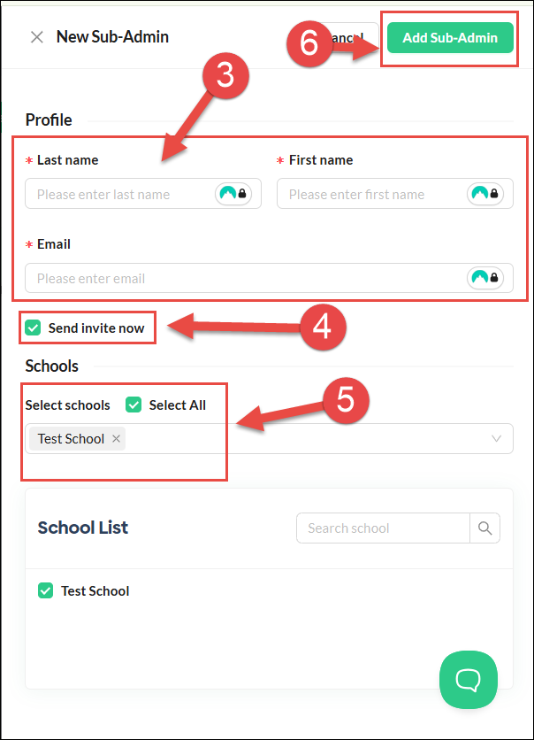 - Enter the new sub-admin's details: last name, first name, and email address.