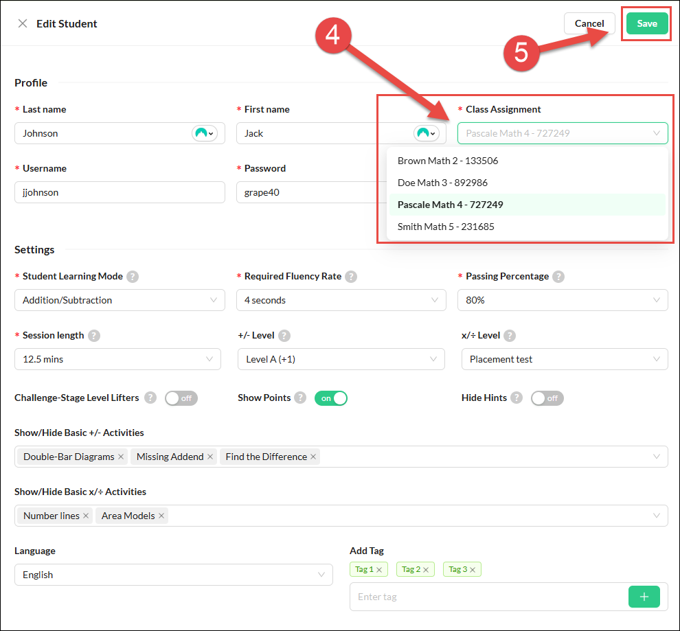 - In the profile area, you'll see the Class Assignment section. Click the Class Assignment drop-down and select the student's new class.