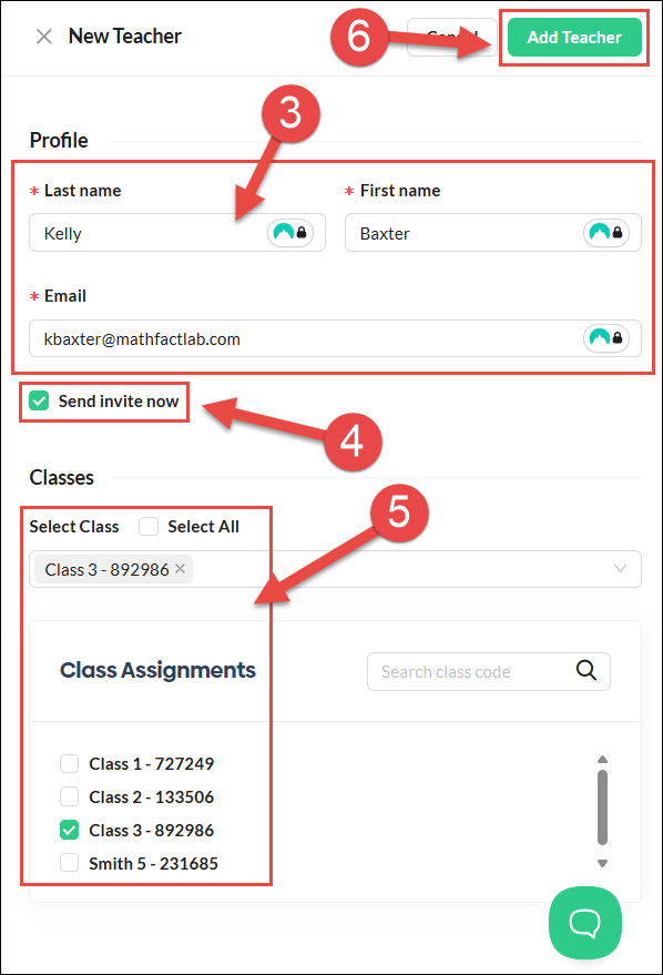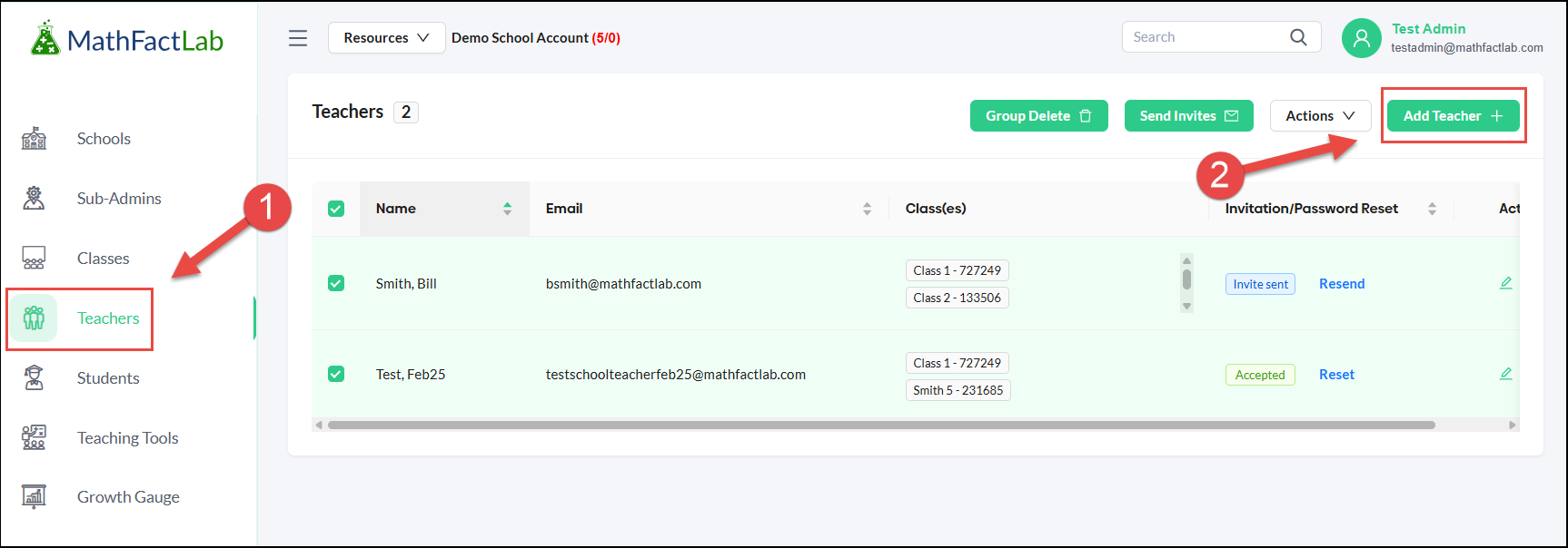 - Teachers can be assigned flexibly. A teacher may be assigned to any number of classes and may teach across multiple schools within the same MathFactLab account.