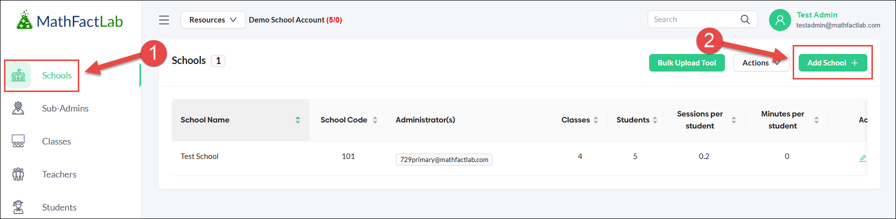 Adding one or more schools is the first step in setting up your MathFactLab account. Once schools are created, you can add classes under each school. After that, you can roster sub-administrators, teachers, and students.
