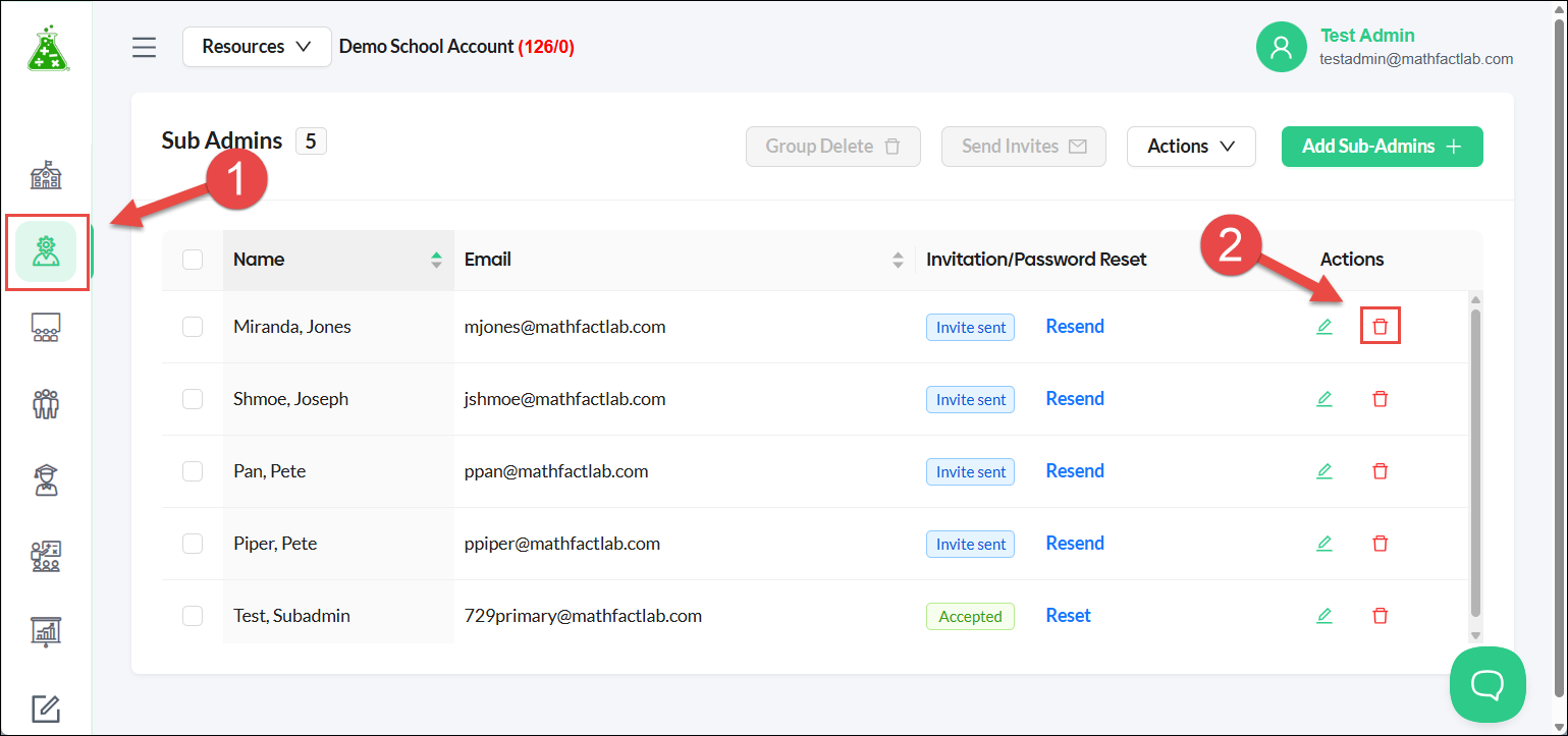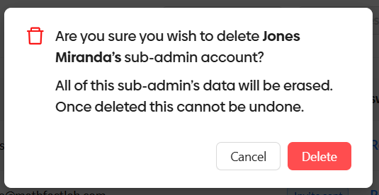 - A sub-administrator can be re-added to the MathFactLab account at any time, but their previous data will not be restored.