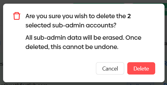 Click on the trashcan icon for the sub-administrator you wish to delete and confirm this deletion in the pop-up window.