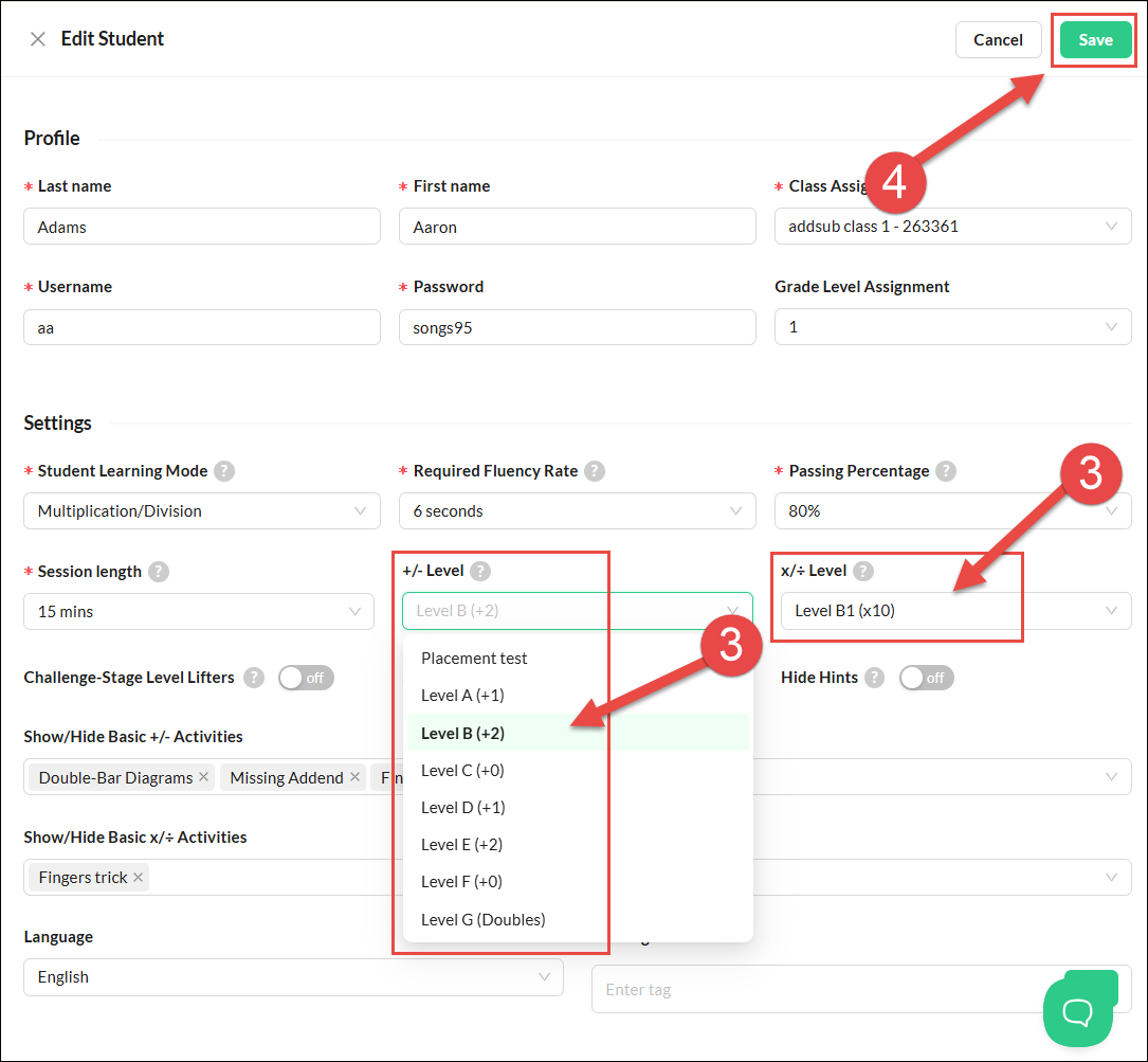 - Select the student's new level for either learning mode from the drop-down menus.