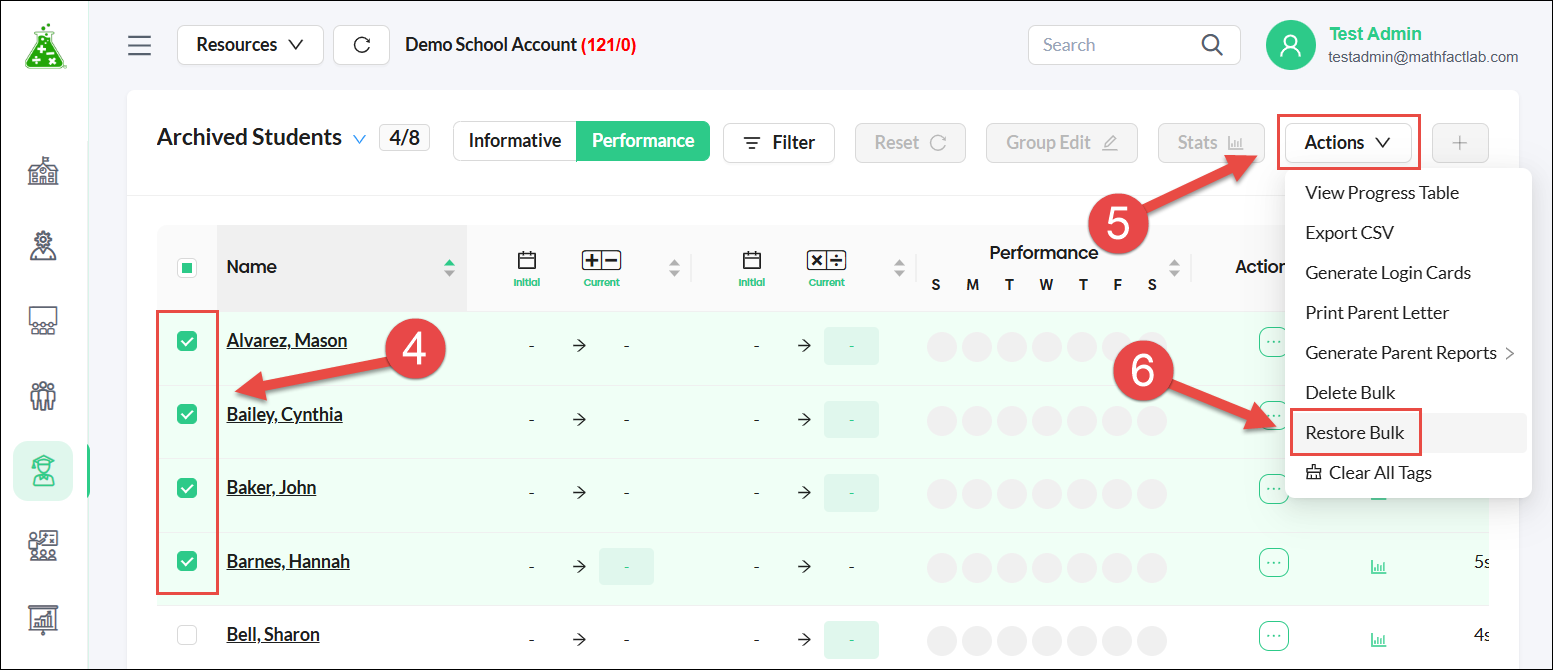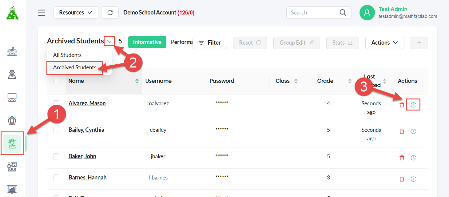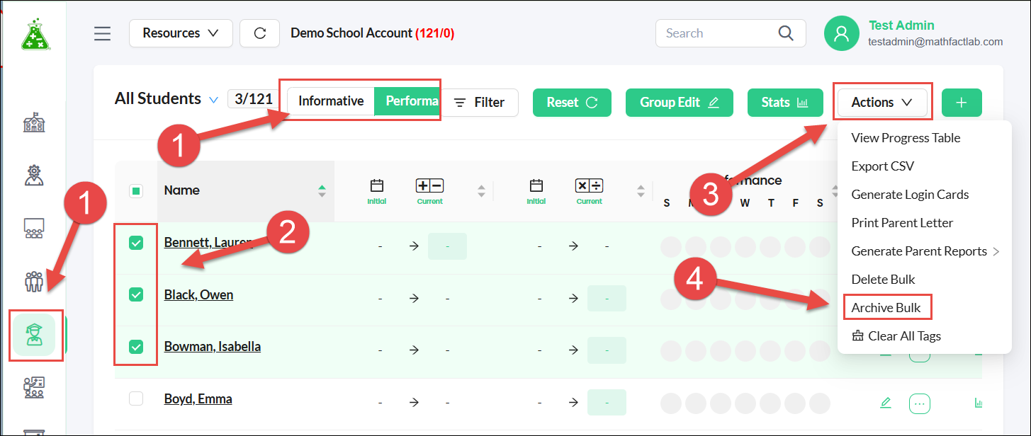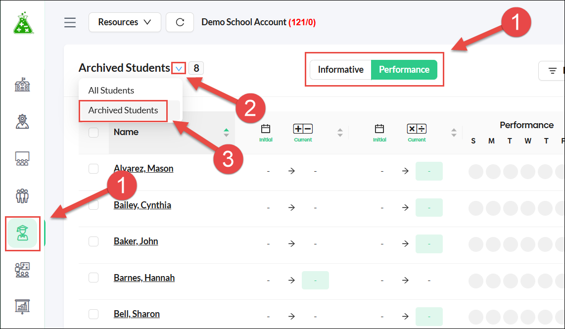 - The archive option is found only in the Informative view of the Students tab.