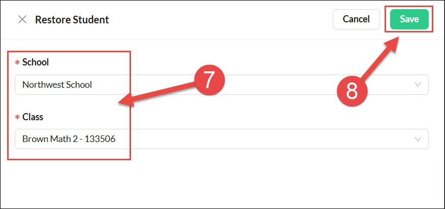 - Select the school and class you would like the students to be restored to.
