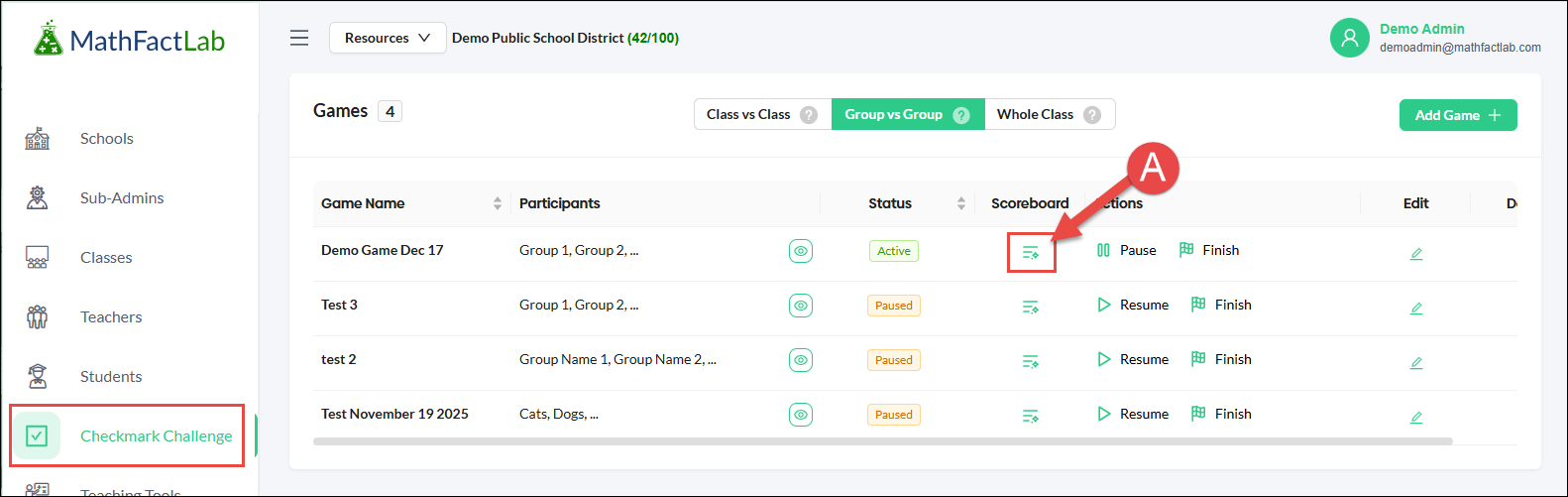 - Teachers can only set up Class vs. Class games between the classes they are assigned in MathFactLab.