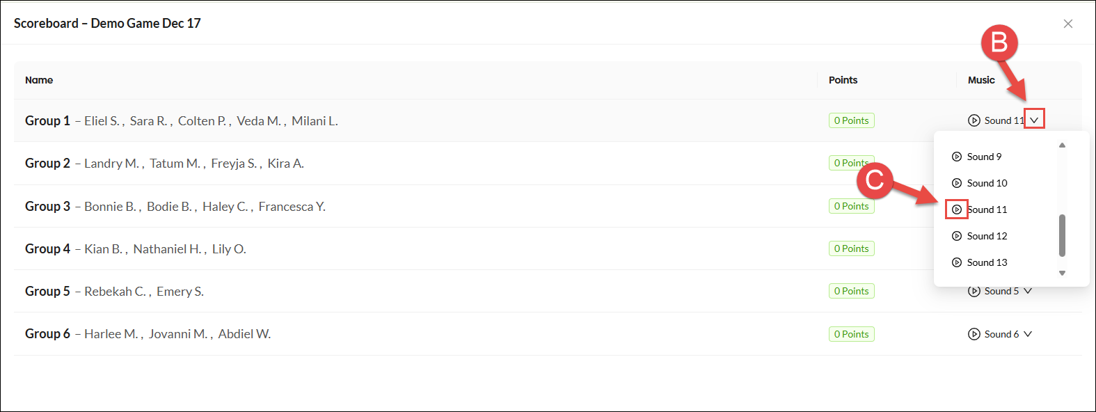 Sounds will have already been randomly assigned to each group, but clicking on the drop-down menu (B) in the Music column will allow you to choose one of the sounds that has not already been selected. Clicking on the play button (C) will let you hear the sound.