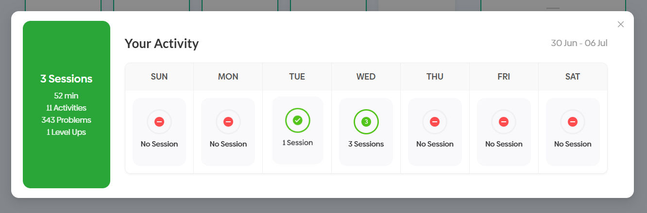 In the 'Your Activity' pop-up window each completed session appears with a checkmark, and multiple sessions in a day are shown as a number. The green summary box on the left displays totals for the entire week.