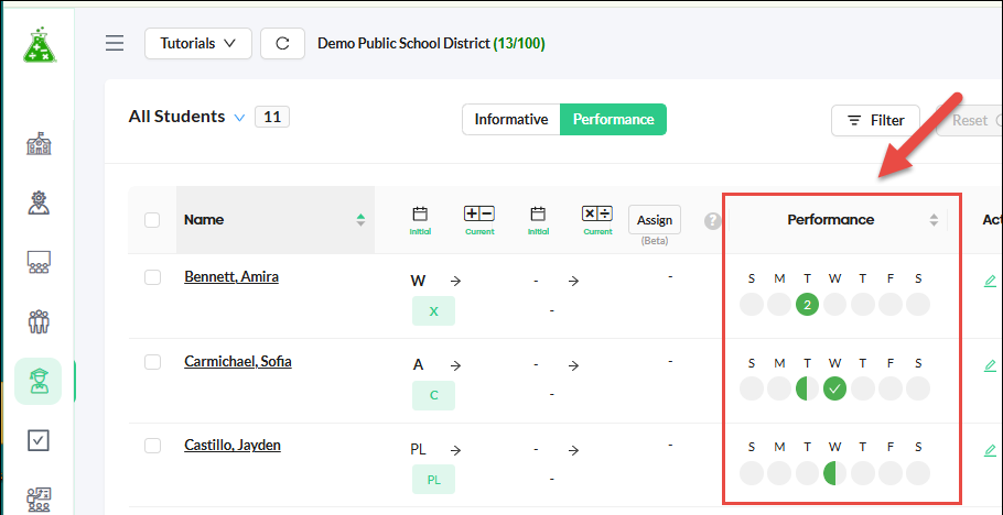 This student-facing report closely mirrors the Performance feature available on the teacher dashboard, providing consistent insight into progress for both students and educators.
