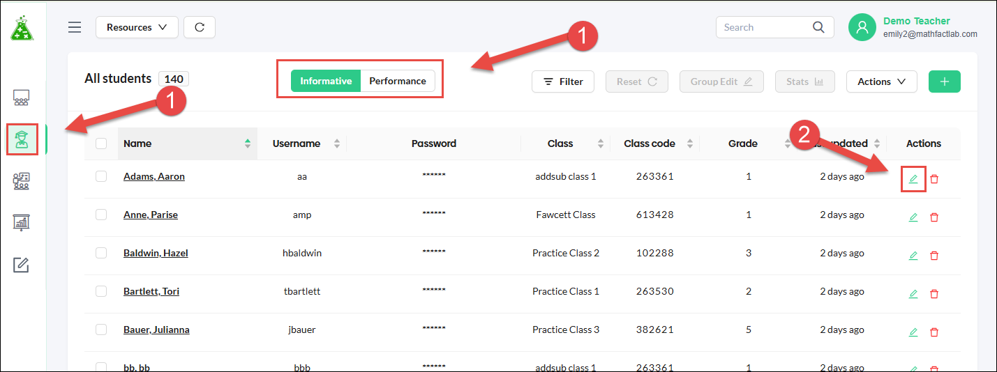 - Click the Edit Student icon on the line of the student whose level you wish to change. You'll find this in the 'Actions' column.