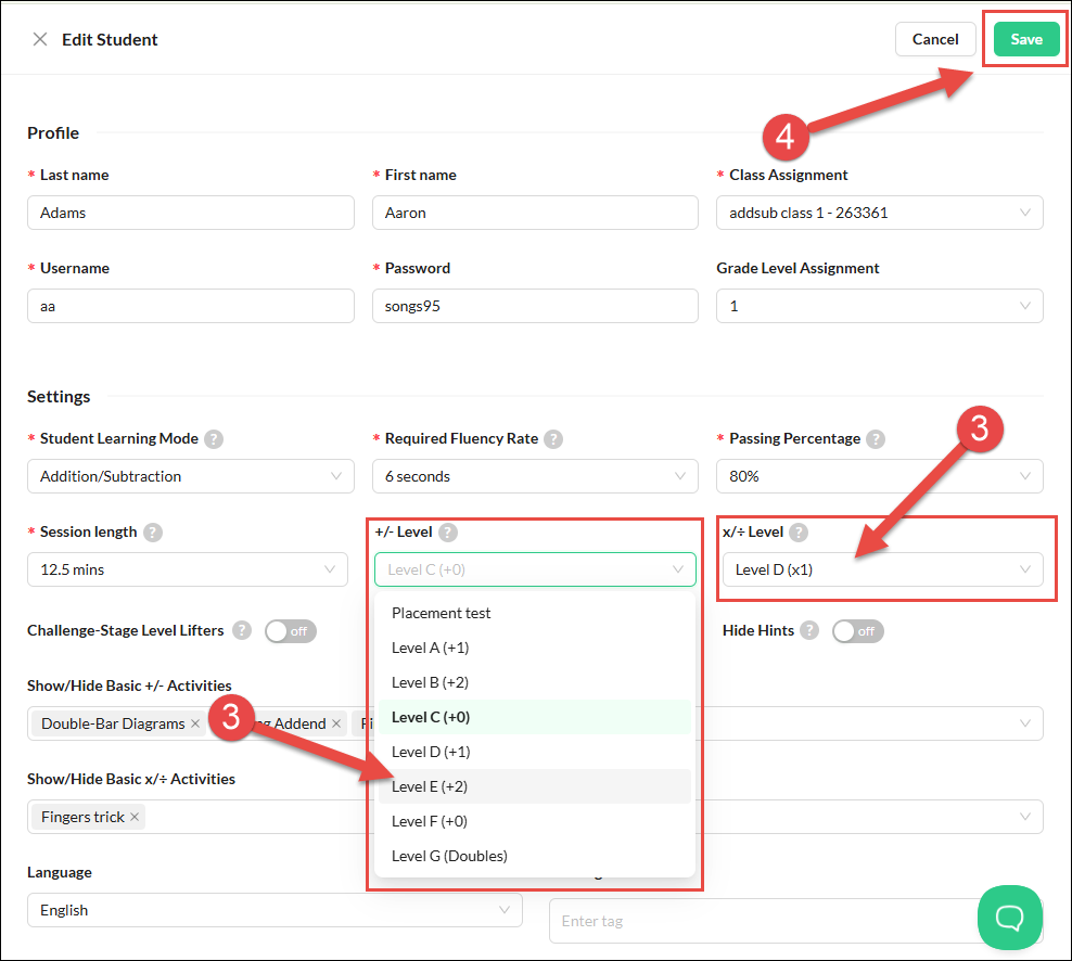 - In the Edit Student window, you can change the level for either or both of the learning modes.