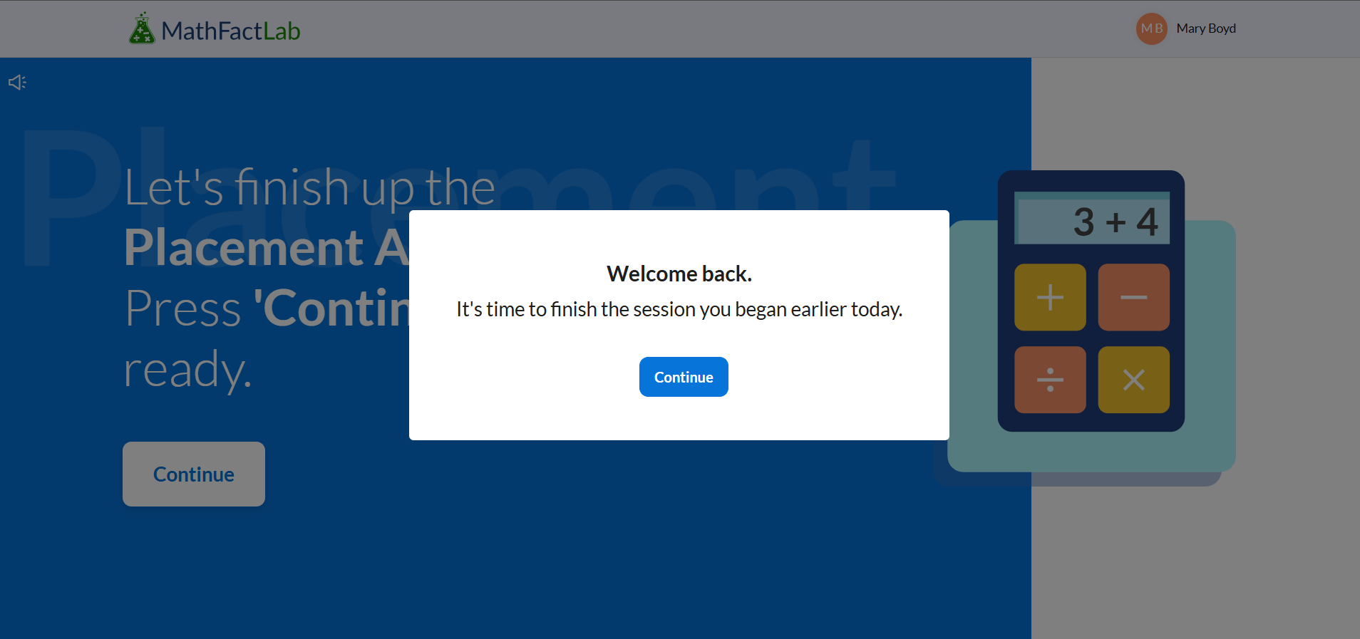 Progress is automatically saved during the MathFactLab placement test. If a student logs out before finishing, when they return to MathFactLab, they will see the message ‘Welcome back. It’s time to finish the session you began earlier today.’ They will then be taken back to the exact point where they left off.