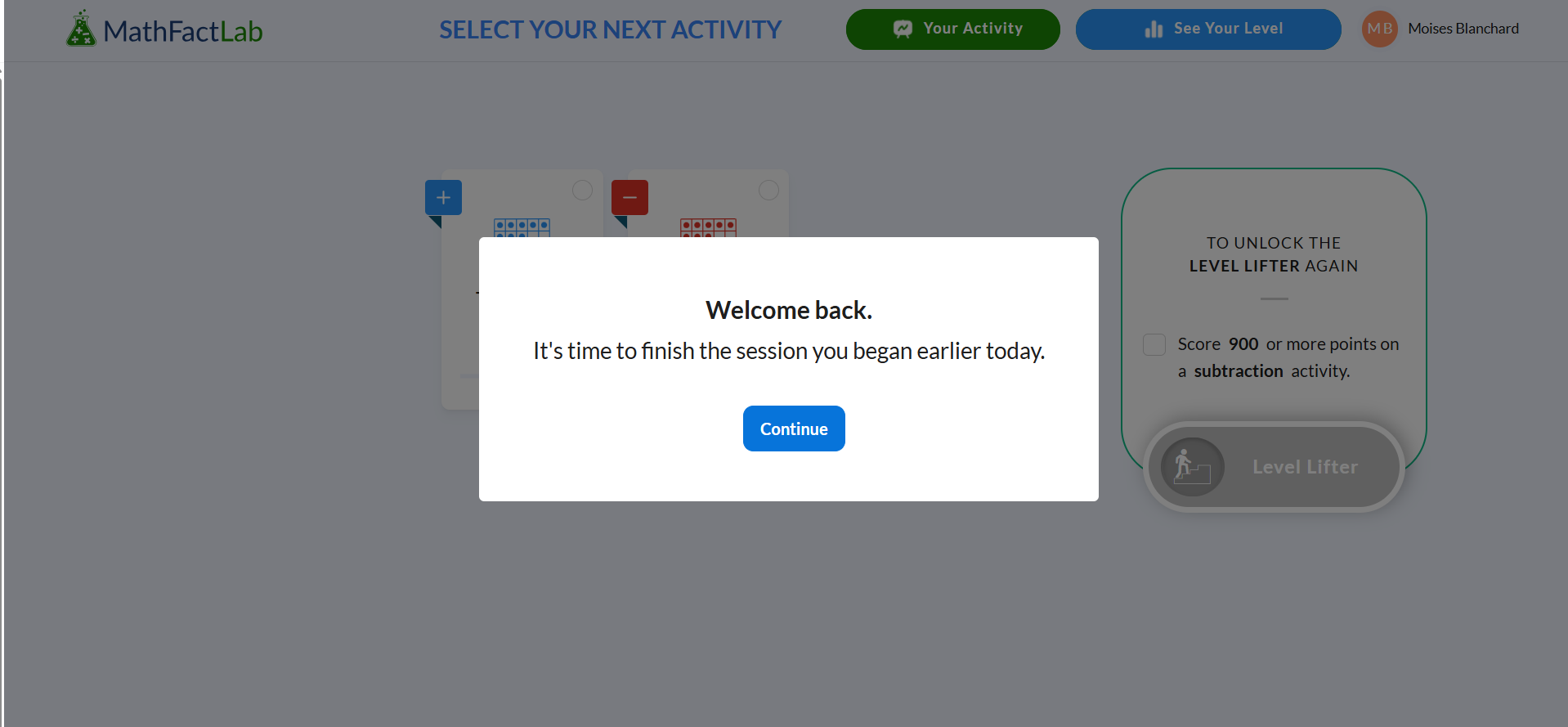 Saving progress on Level Lifters is still under development and requires additional testing. We will alert our schools when this feature is available. When complete, students will be able to resume a Level Lifter once, but will not be able to continue the Level Lifter if they log out of it a second time.