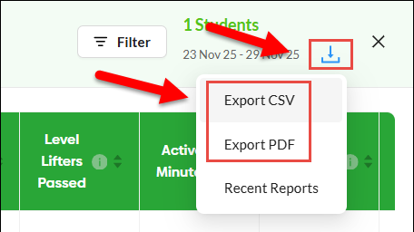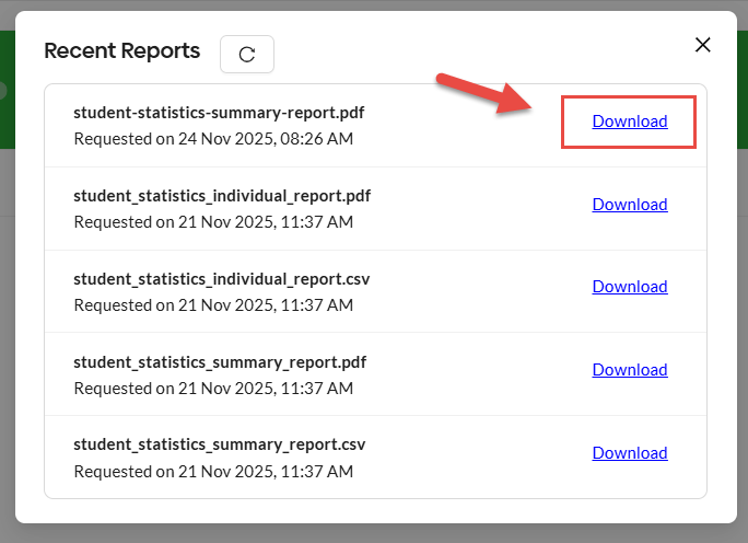Individual and group statistics reports (in CSV or PDF format) are typically delivered by email after you click the export icon and select the file type. However, some school district email filters occasionally block these messages, preventing them from reaching teachers or administrators.