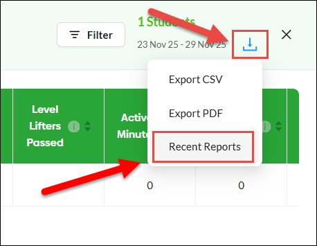 Choosing 'Recent Reports' from the Export drop-down menu below will allow reports sent within the last 30 days to be downloaded.
