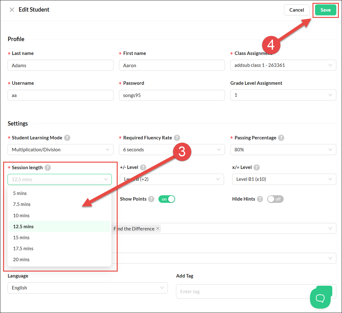 - In the Edit Student Menu, select the desired duration for the student's work sessions.