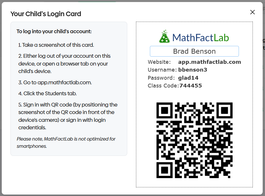 - The login card provides all the information students need to log into their MathFactLab account: