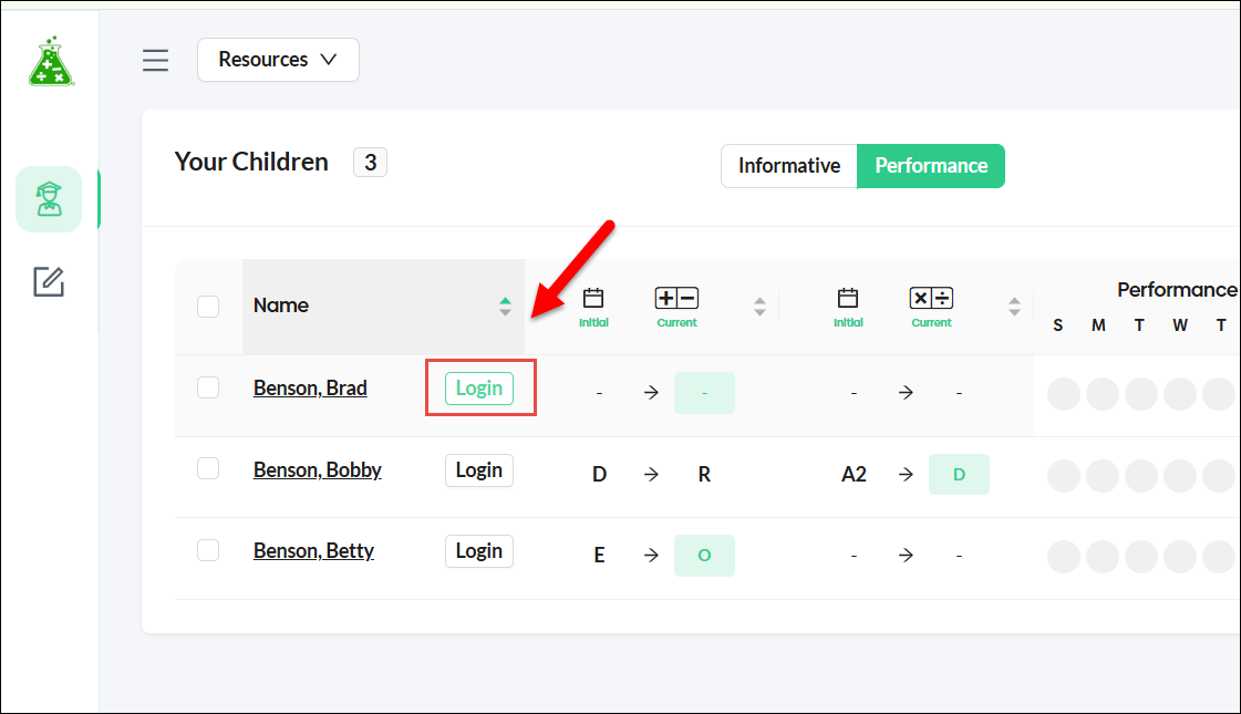 Alternatively, click on the login button beside your child's name to directly log into your child's MathFactLab account on the same device.