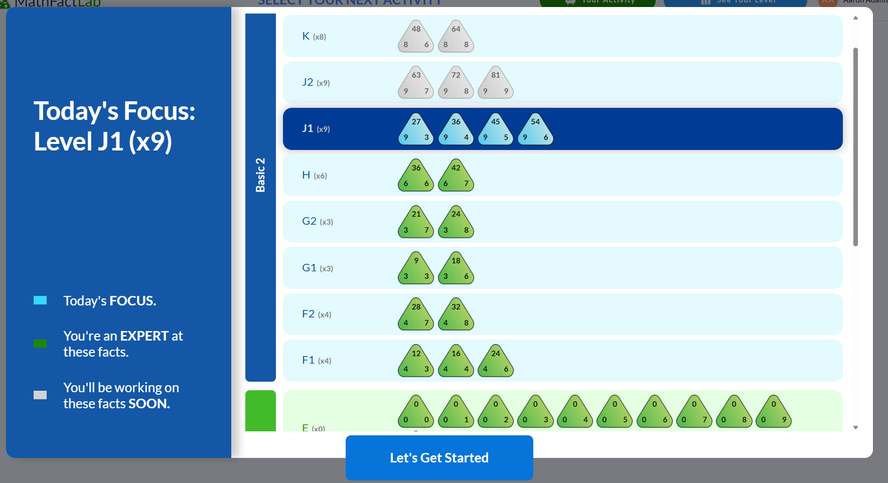 After the placement test is completed, students are shown a progress table and can see which level they are assigned to within the program. They see the levels of facts that they have demonstrated mastery in in green, the facts that they'll be focusing on in their current level in blue, and they see the levels ahead of them in grey.