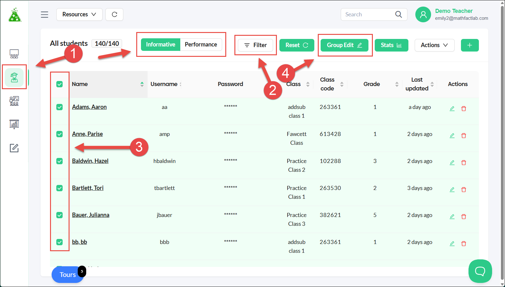 - Select the Students tab. You will be able to make group edits in either Informative or Performance mode.