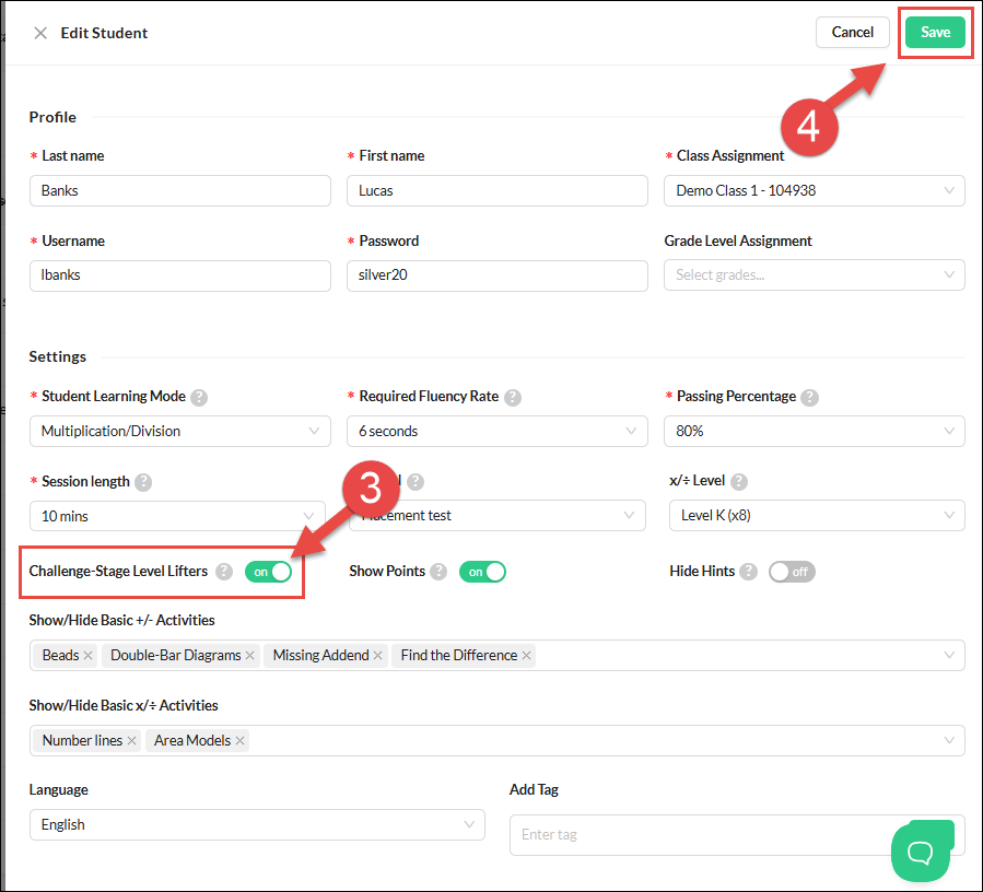 To turn on Challenge-Stage Level Lifters for an Individual Student: