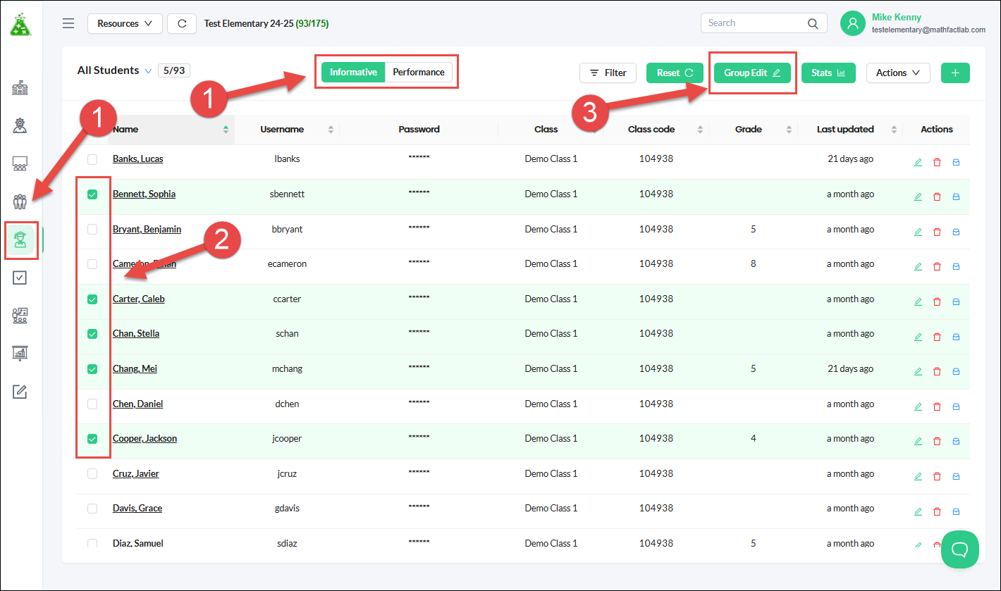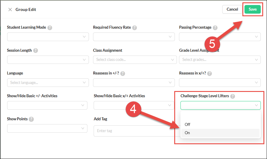 To turn on Challenge-Stage Level Lifters for Multiple Students: